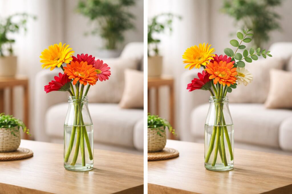 左:ガーベラ⇒右:ユーカリを追加